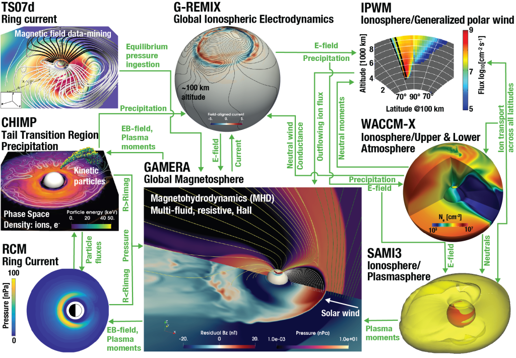 Earth’s space environment is a complicated system with many different parts. Modeling these different regions requires different numerical techniques and physical approximations for the different regions. Therefore, space weather modeling requires coupled networks of models that exchange information across boundaries.